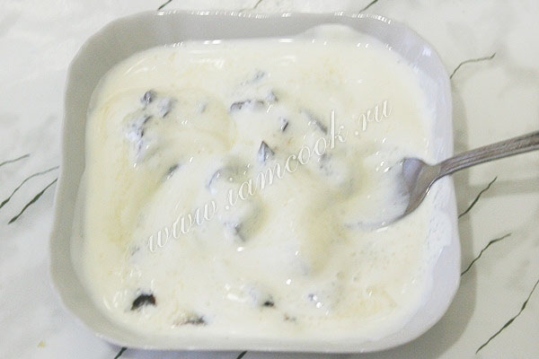 Смешайте сметану с черносливом и сахаром.