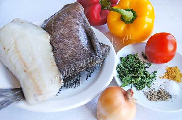 Помимо рыбного филе нам понадобятся достаточно простые ингредиенты: болгарский перец, репчатый лук, помидор, зелень и немного приправ.