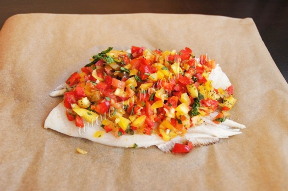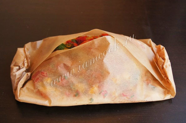 Завернуть края пекарской бумаги и уложить все блюдо в форму для запекания. Убрать рыбу с овощами в разогретый до 200 градусов духовой шкаф на 25-30 минут.