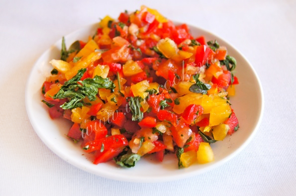 Помидор, сладкий перец и репчатый лук вымыть очистить и мелко порубить. Смешать их с зеленью, приправить солью и перцем по вкусу. Перемешать.