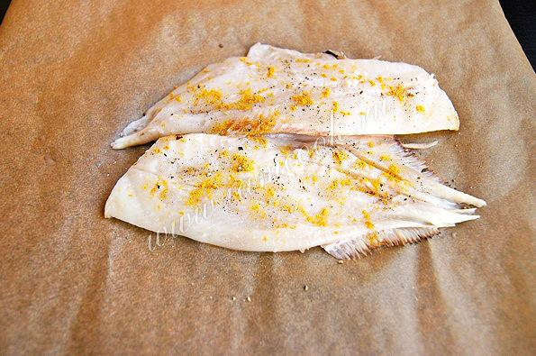 Выложить филе дори на бумагу для запекания. Приправить карри, солью и черным молотым перцем по вкусу.