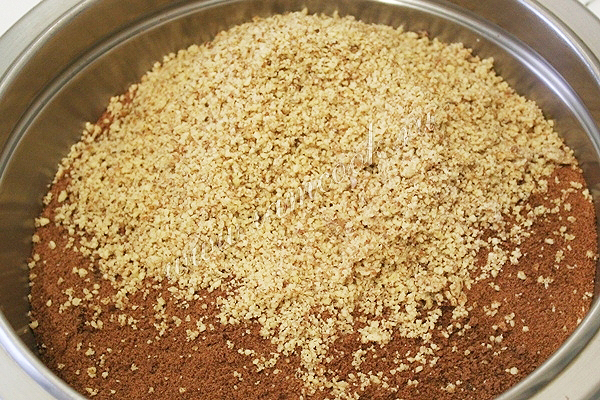 Орехи и бисквитные сухари пропустите через мясорубку или измельчите в блендере.