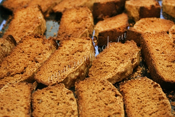 Порежьте бисквит на небольшие кусочки и просушите в духовке до состояния сухарей. Сушить примерно 10 минут при 180 градусах и потом оставить их в выключенной духовке на час.