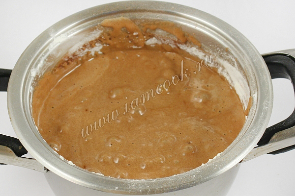 Аккуратно небольшими порциями введите муку. Перемешивайте ложкой снизу-вверх.