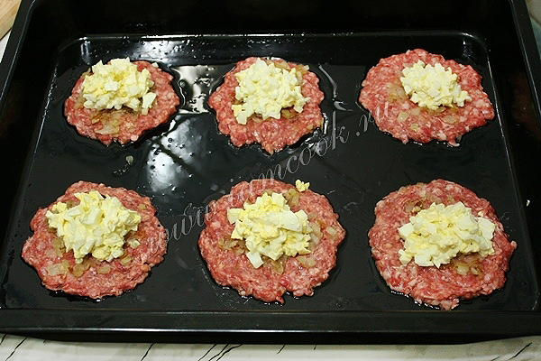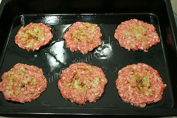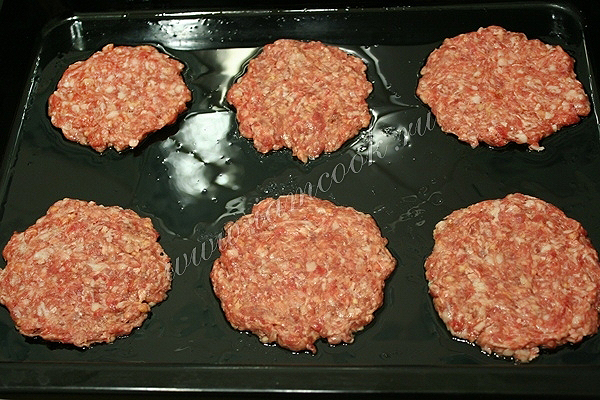 Противень смажьте маслом. Фарш посолите, поперчите по вкусу и хорошо перемешать. Сделайте из фарша лепешки и выложите на противень.