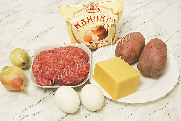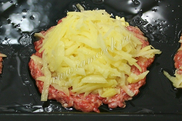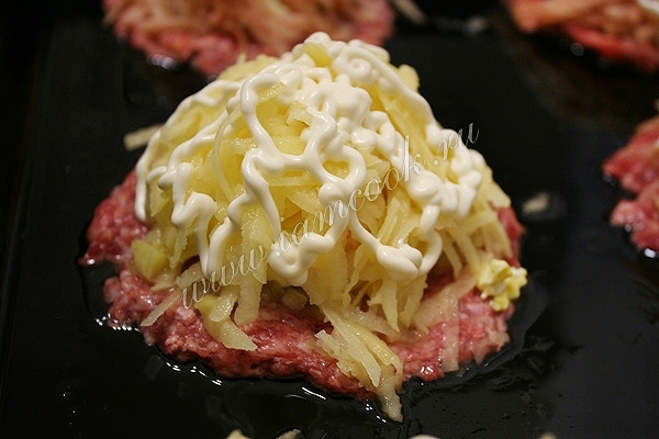 "Оно представляет собой мясной блинчик, поверх которого выложены, предварительно приготовленные картофель, яйца, лук и сыр"
