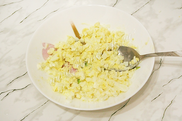 Сыр смешиваю с майонезом и яйцом, протертым на крупной терке, добавляю столовую ложку горчицы, для остроты.