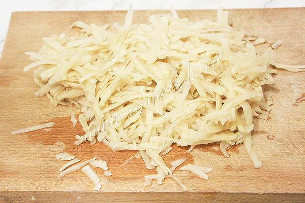 Сырую картошку натираю на крупной терке и заливаю холодной, хорошо, подсоленной водой, выдерживаю 30мин, приблизительно.