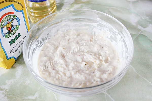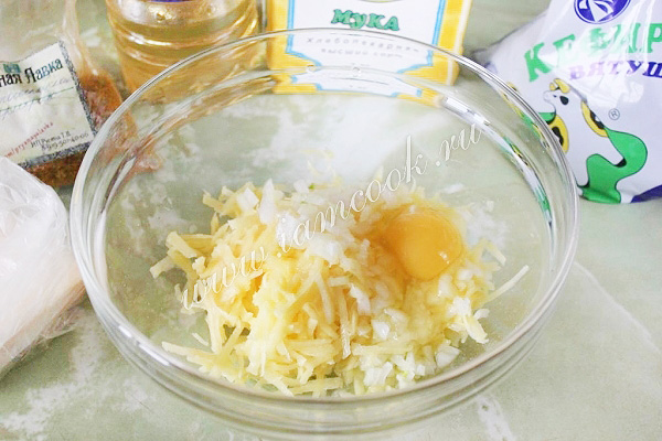 Натрите сырой картофель, добавьте яйцо и рубленый лук. Перемешайте.