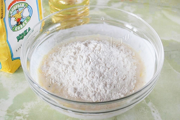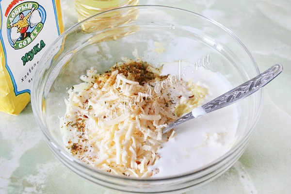 Затем добавьте кефир, тертый сыр и специи, перемешайте.