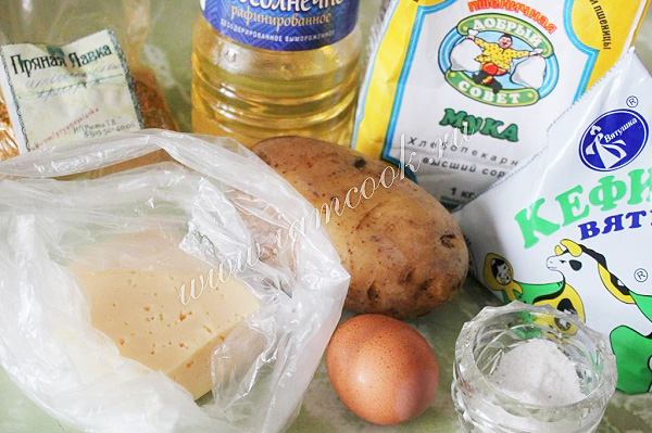 Подготовьте картофель, лук, муку, яйцо, соль, ароматные травы, кефир, сыр и растительное масло:
