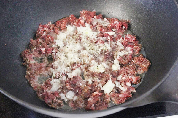 Обжарьте фарш с луком и специями или рискните использовать сырой.