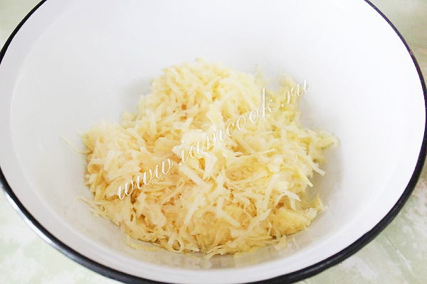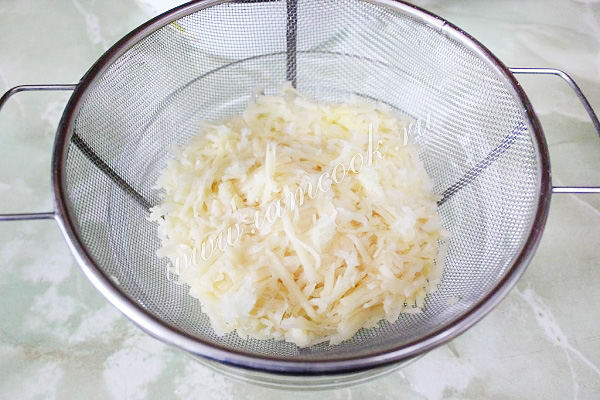 Сырой картофель натрите, добавляя луковое пюре и поместите в сито или в марлю, чтобы стекал сок.