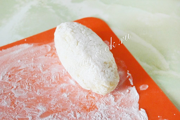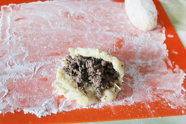 Выместите картофельное тесто, оно получится липким и эластичным. Разделите его на порции и из каждой порции теста влажными руками (или в полиэтиленовых перчатках) слепите сначала лепешку, уложите на неё порцию фарша и сформируйте цеппеллин - этакий дирижаблик. Его нужно припудрить крахмалом, который предварительно насыпан на поверхность доски.
