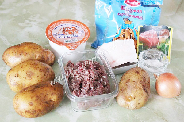 Подготовьте для цеппелинов картофель сырой и сваренный в "мундире", лук, крахмал, мясной фарш, соль и перцы, а для подливы: сало, лук и сметану. Свежая зелень для подачи тоже будет не лишней.