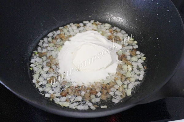 Для подливы обжарьте кусочки сала с луком до золотистого цвета, потом добавьте сметану и потушите всё вместе пару минут.