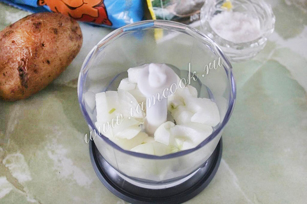 Измельчите лук, половина лука пойдет к фаршу, а вторая половина понадобится для картофельного теста, чтобы он не темнел.