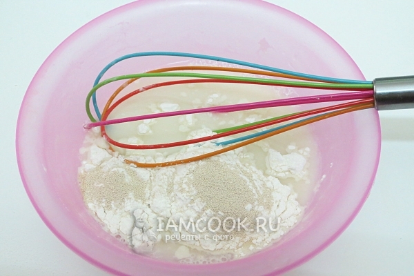 В тёплый кефир добавляем сахар, дрожжи и 100 граммов муки, перемешиваем. Это опара. Делаем её мы для того, чтобы ускорить брожение, приготовление теста.