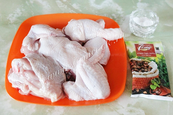 Разделайте курицу на кусочки и сварите обычный бульон с перцем и сухой зеленью.