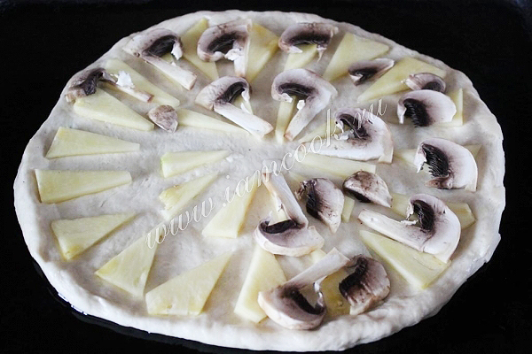 На смазанный растительным (оливковым) маслом противень уложите тонкую лепешку из теста. Разложите на ней дольки ананаса и шампиньонов.