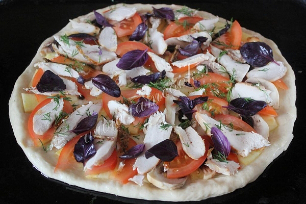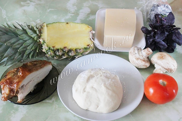 Подготовьте для неё дрожжевое тесто для пиццы (рецепт на сайте есть), ананас (свежи или консервированный), готовое куриное мясо (отварное, запеченное, жареное или пастрому), свежие шампиньоны, помидор (или томатный соус), свежую зелень и сыр.
