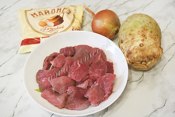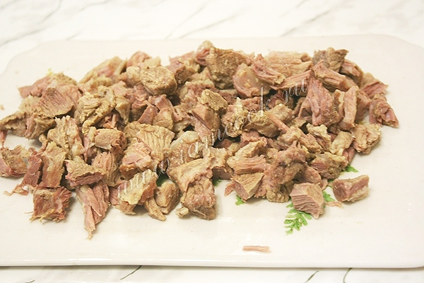 Говядину отварите до готовности. Нарежьте мясо небольшими кусочками.