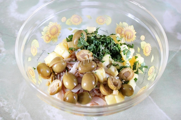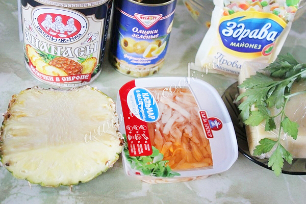 Подготовьте свежий или консервированный ананас, кальмаров готовых (отварных или консервированных), оливки маринованные, сыр и петрушку.