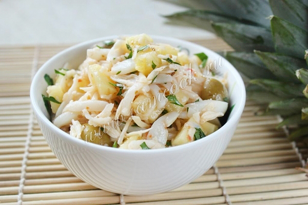 Кальмары и ананас ... отлично сочетаются в салате. Сегодня я хочу предложить вам приготовить вкусный салат из этих ингредиентов. Подать его можно на праздничный стол или просто так в качестве закуски.