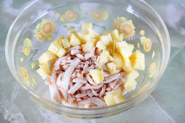 Перемешайте все ингредиенты в блюде и салат с кальмарами и ананасами готов. Подавайте его к основным блюдам.