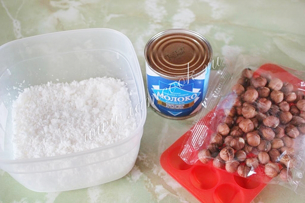 Подготовьте сгущенное молоко, кокосовую стружку и фундук.
