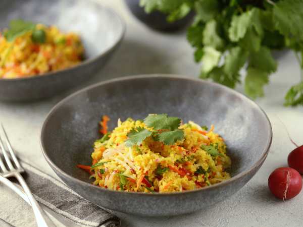 Сок моркови и яблока перемешивается с заправкой, получается очень гармоничный вкус. Дадим салату 10-15 минут пропитаться, украсим зеленью и подаём на стол. Если вы готовите для взрослых - добавьте немного острого перца, он дополнит и оттенит вкус салата.