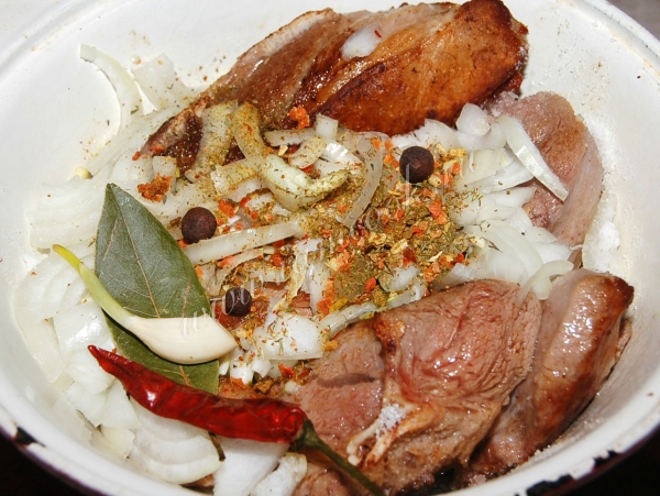 К баранине добавить мелко нарезанный репчатый лук и специи. Из специй я использовала лавровый лист, душистый перец, чеснок, сушеный острый перец и рыночный набор специй для баранины. Лавровый лист и острый перец потом выкинуть.