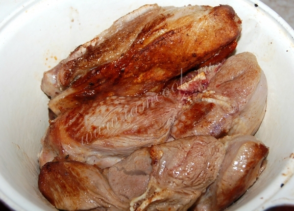 Обжаренное мясо положить в казанок.