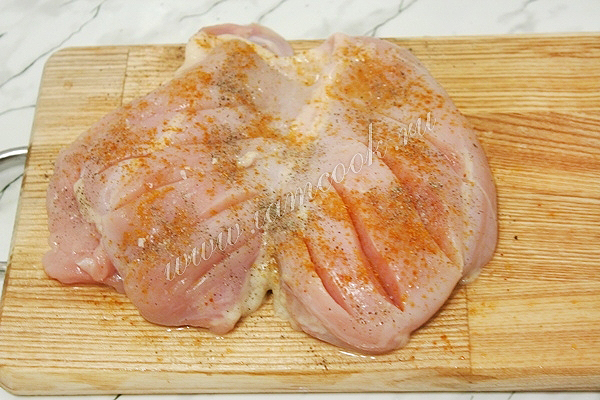 Куриное филе посолите, посыпьте приправой для курицы и черным молотым перцем и отставьте на 10-15 минут в холодильник.