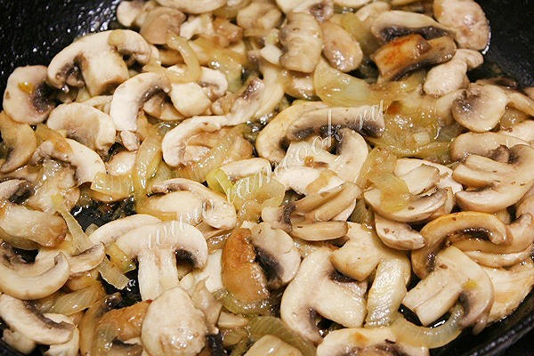 Добавьте к луку нарезанные шампиньоны и жарьте еще примерно 7-10 минут на среднем огне. Немного посолите и хорошо перемешайте.