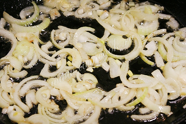 Разогрейте сковороду, налейте немного растительного масла и обжарьте лук до слегка золотистого цвета.