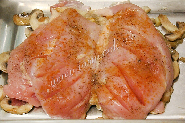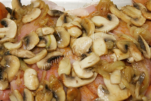 На куриное филе выложите оставшиеся грибы с луком.