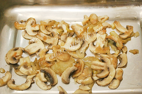 В форму для запекания выложите половину жареных грибов с луком.