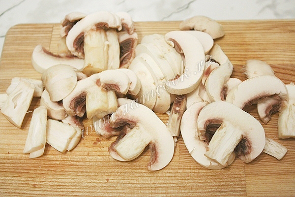 Шампиньоны помойте, почистите и нарежьте крупными кусочками.