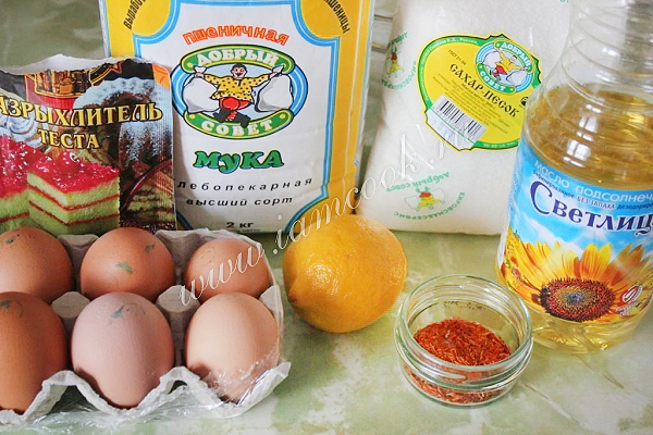 Подготовьте муку, разрыхлитель, сахар, лимон, растительное масло, качественный шафран и яйца.