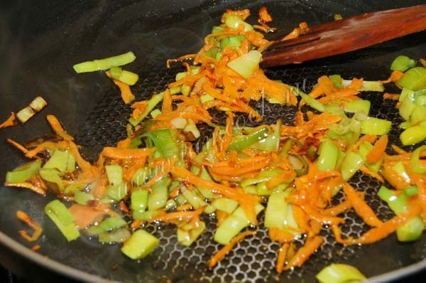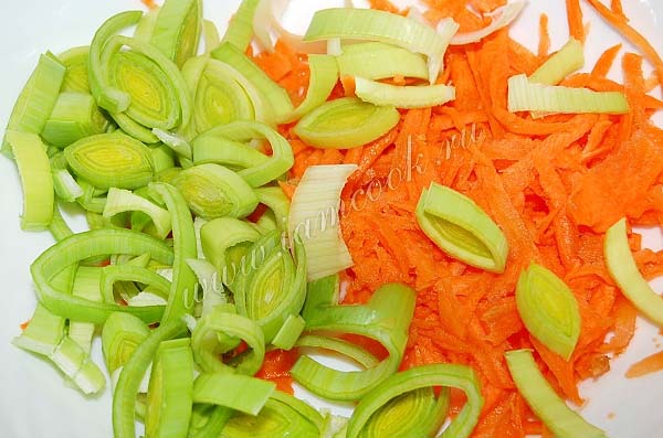 Морковь натереть на крупной терке, лук порей нарезать.