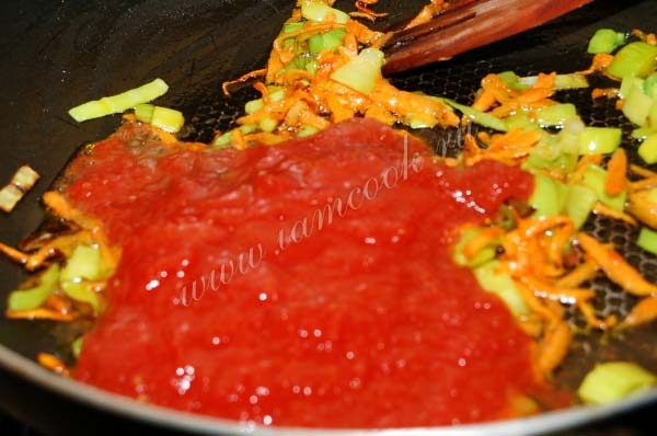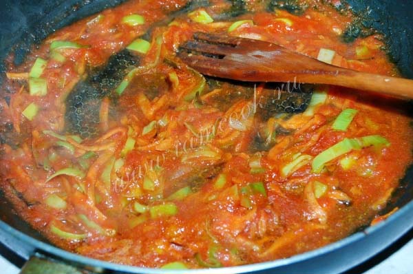 Когда лук порей с морковью будут почти готовы, добавить томатное пюре и обжаривать еще 5 минут.