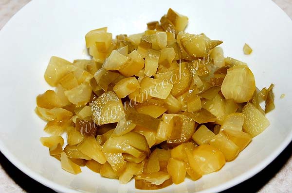 Когда картошка с капустой будут почти готовы, добавить в кастрюлю нарезанные соленые огурцы. Если их положить раньше остальных овощей, то овощи не разварятся и останутся жесткими.