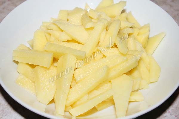Почистим картошку, нарежем ее небольшими брусочками и отправим в кастрюлю.