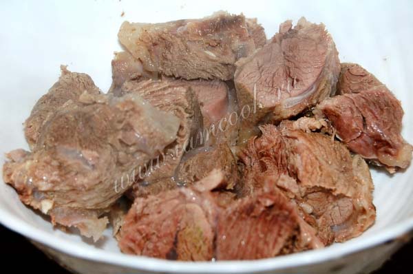Через 1,5 часа начинаем собирать суп. Достанем мясо, нарежем его кусочками и отправим обратно в кастрюлю.