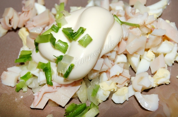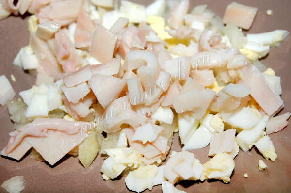 Кальмары вареные нарезать мелкими кубиками и добавить к луку с яйцом.