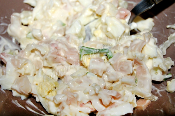 Вкусный салат из кальмаров с сыром готов. Приятного аппетита!