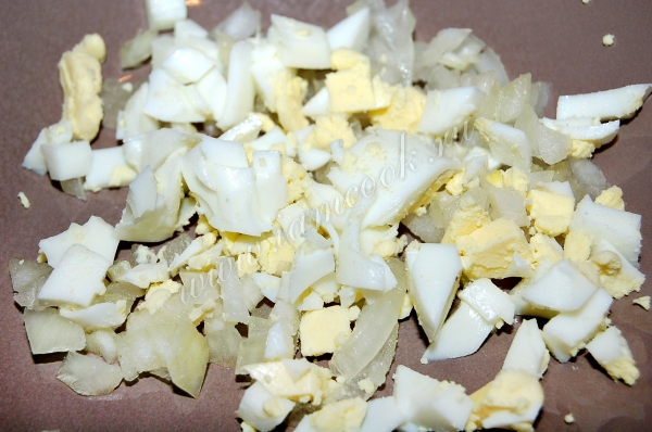 Яйца отварить вкрутую, мелко нарезать и добавить к луку.