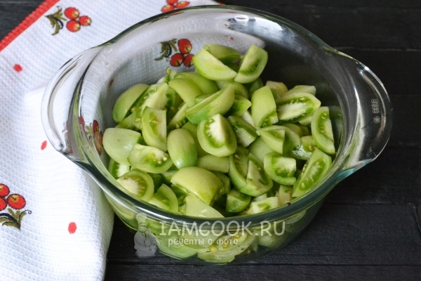 Овощи нужно подготовить. Помидоры вымыть холодной водой и просушить, предварительно удалив плодоножку. Порезать сначала на две части, а затем - на четыре или на шесть долек.