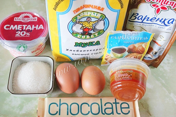 Подготовьте мёд, муку с разрыхлителем, сахар, яйца, сметану, сгущенку и что-нибудь для оформления, например, шоколад.